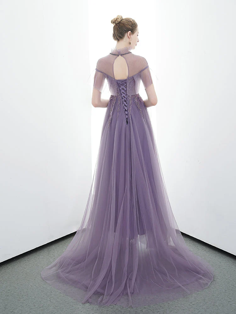 A-line Tulle Long High Neck Purple Prom Dress With Ruffles OKR86
