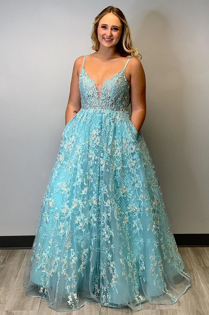A-line Spaghetti Straps Lace Appliques Prom Dress Modest Long Evening Dress With Pockets OKS19