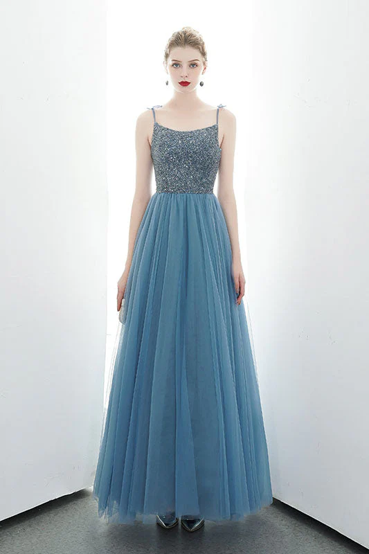 A-line Spaghetti Straps Blue Lace Up Back Beading Tulle Long Prom Dress OKR84