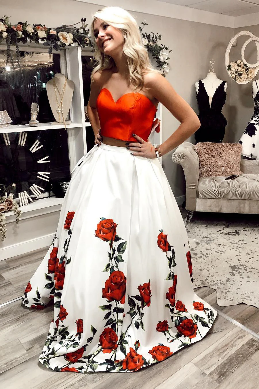 Charming Two Piece A Line Sweetheart Floral Long Prom Dress OKS3