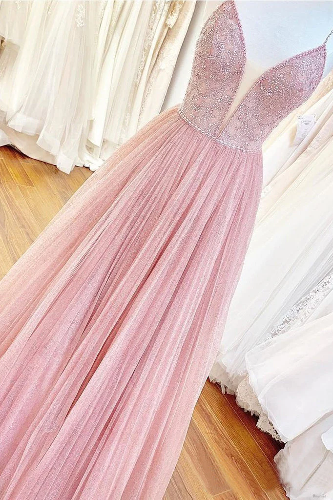 Long Beaded Bodice V-neck Neckline Chiffon Pink Prom Dress OKS7