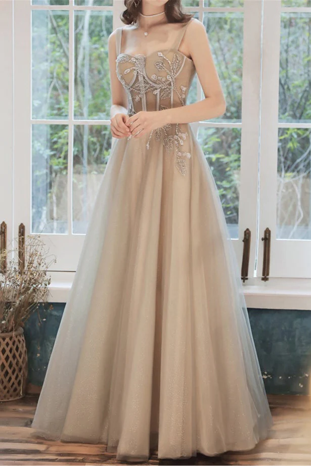 Spaghetti Straps A-line Long Prom Dress Fairy Tulle Evening Gown OKV86