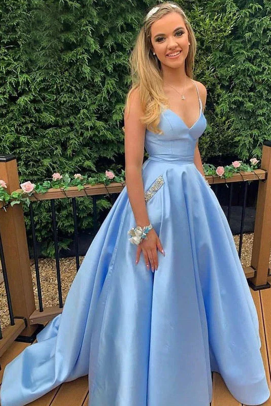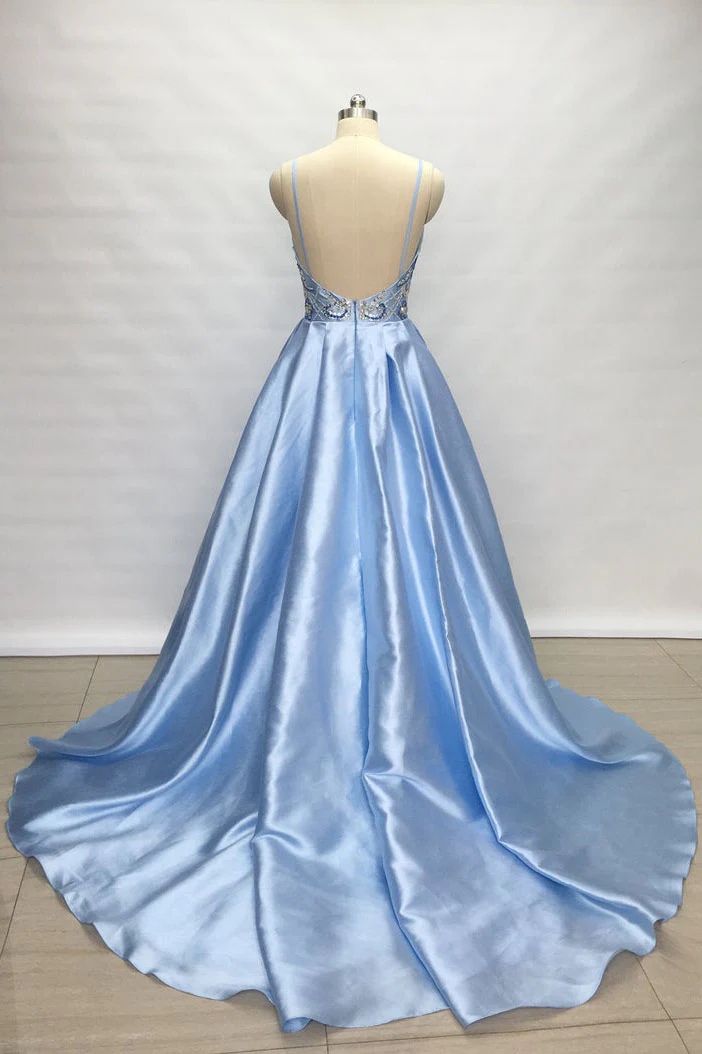 Sky Blue Long V-neck Spaghetti Straps Prom Dress Simple Satin Women Prom Gown With High Slit OKV71