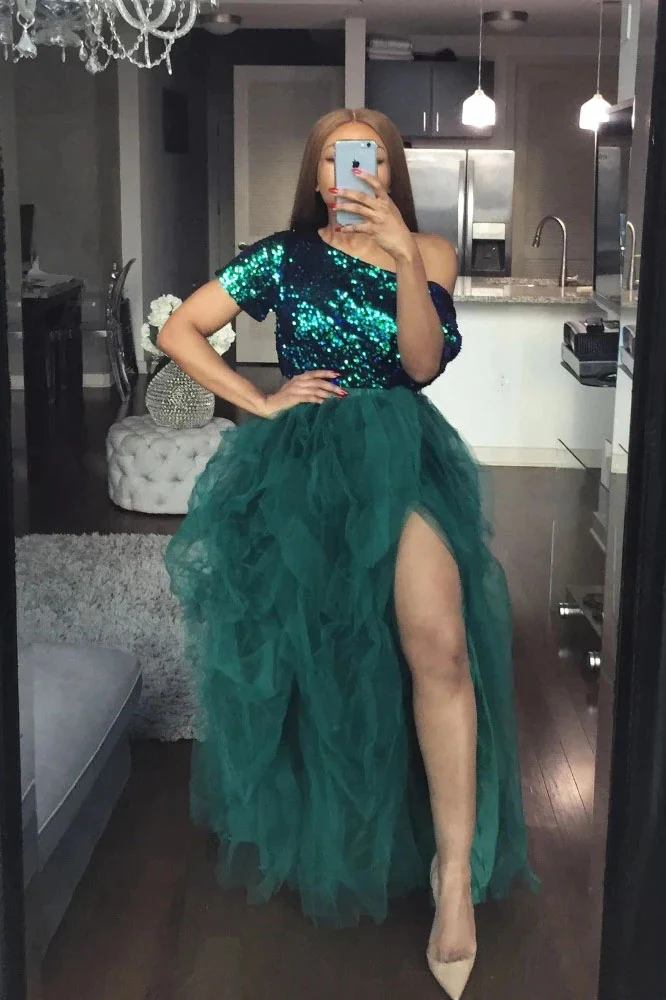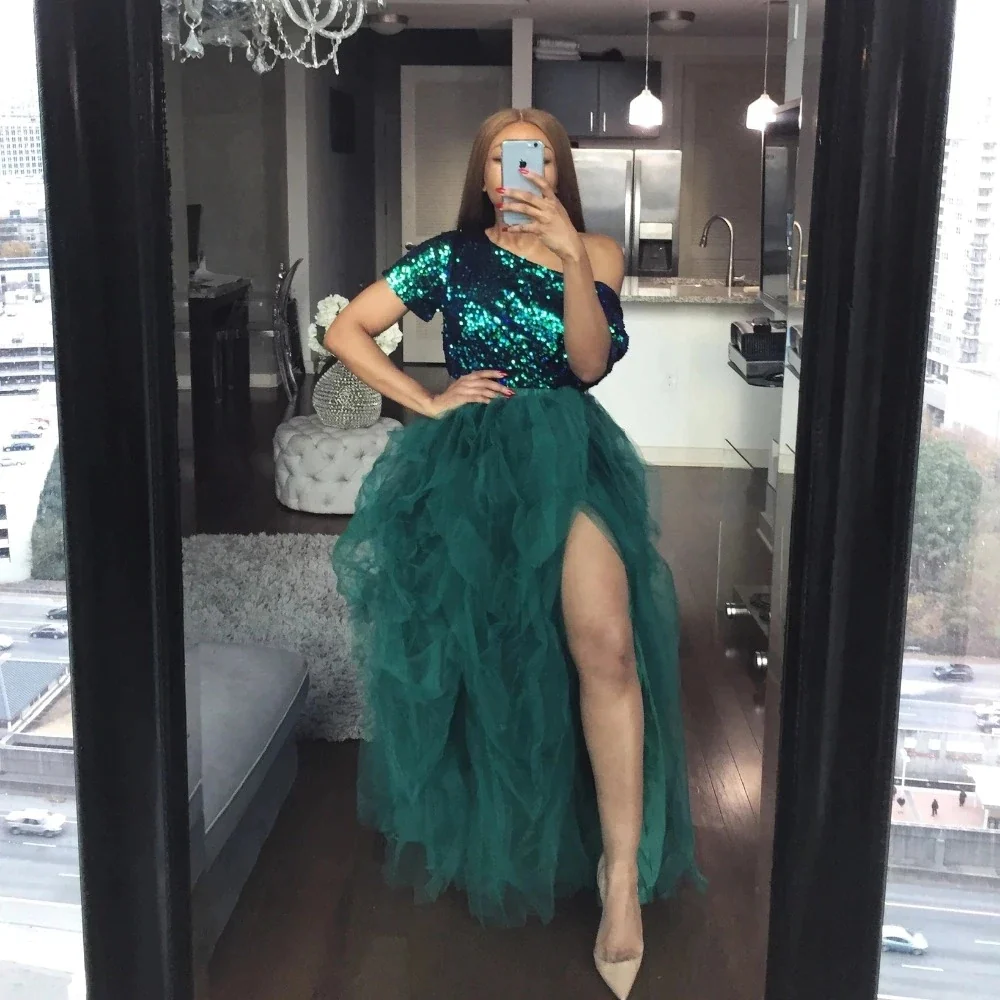 High Slit Tulle Puffy A-line Prom Dress Forest Green Long Ruffles Party Gown OKW47