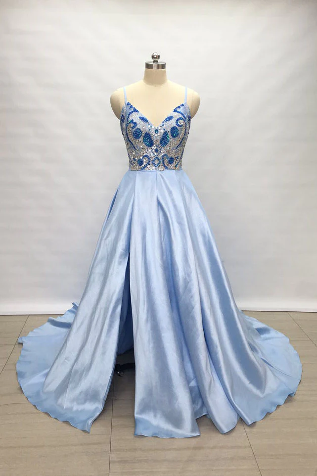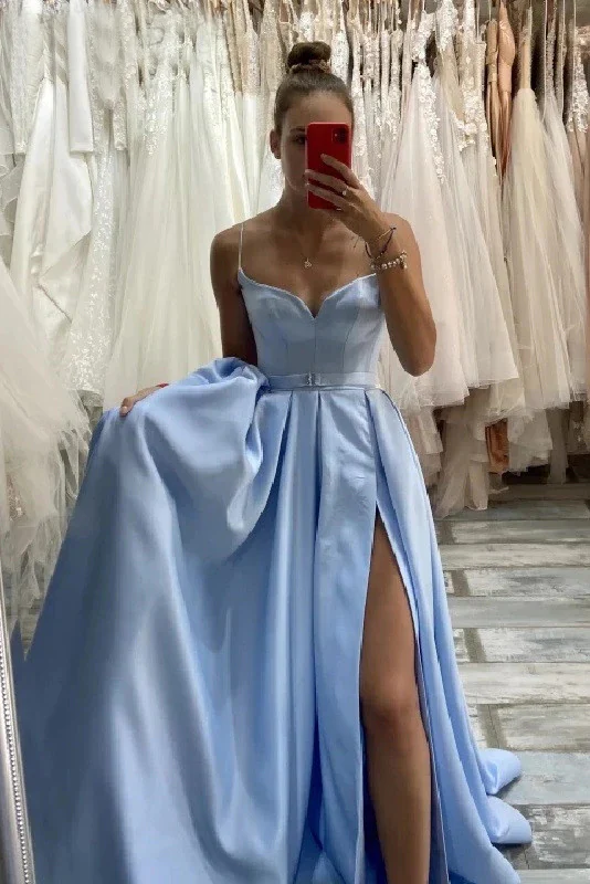Light Blue Long Spaghetti Straps Prom Dress Sexy Split A-line Evening Dress Party For Womens OKV95