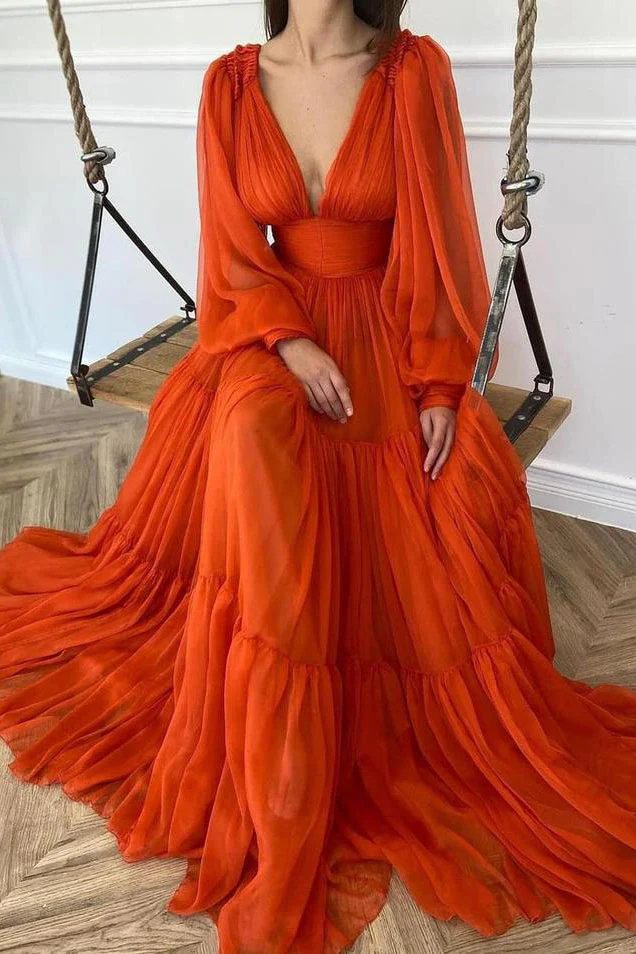 Long Sleeves A-line Deep V Neck Orange Simple Prom Dress Maxi Dress OKV98