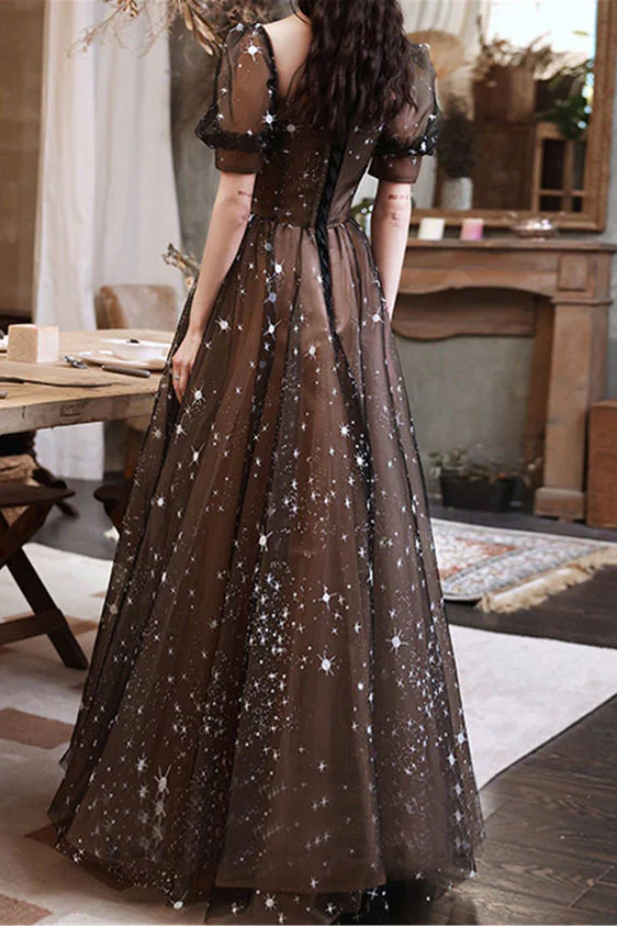 Black And Brown A-line Prom Dress. Short Sleeves Evening Dress Sequin Princess Dress OKW8