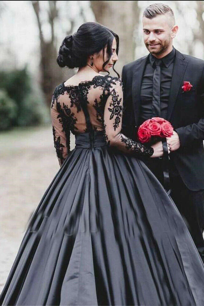 Black Gothic A-line Lace Appliqued Long Sleeves Prom Dress OKW61