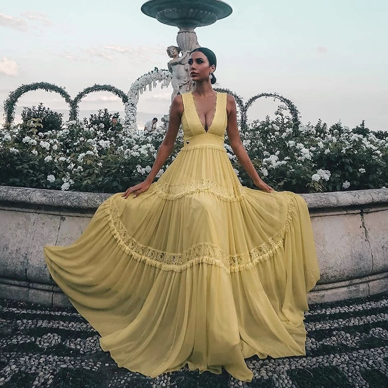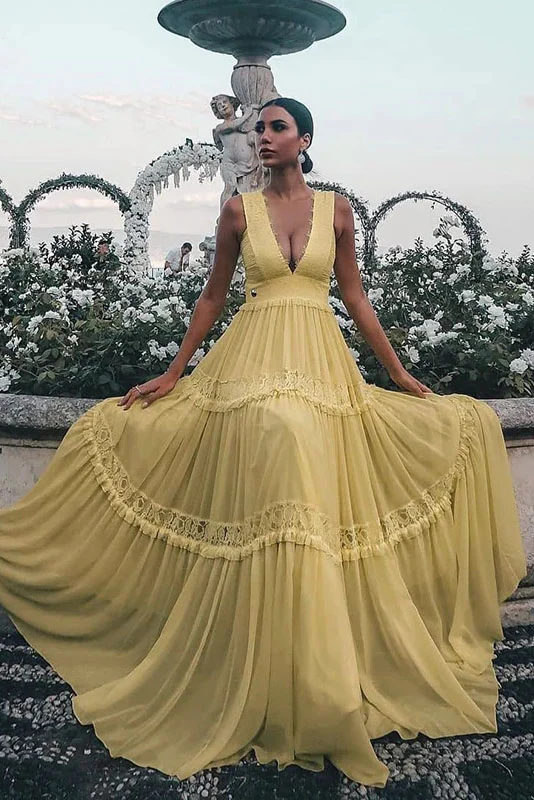Gorgeous Yellow V-Neck Sleeveless Lace Appliques Chiffon Prom Dress OKW48