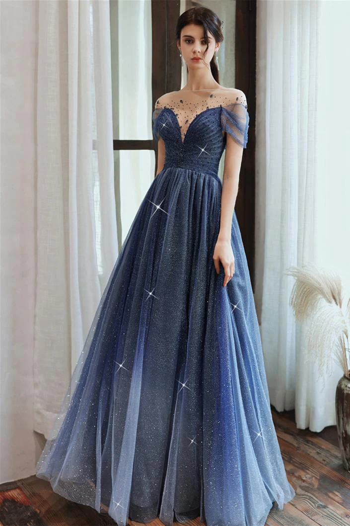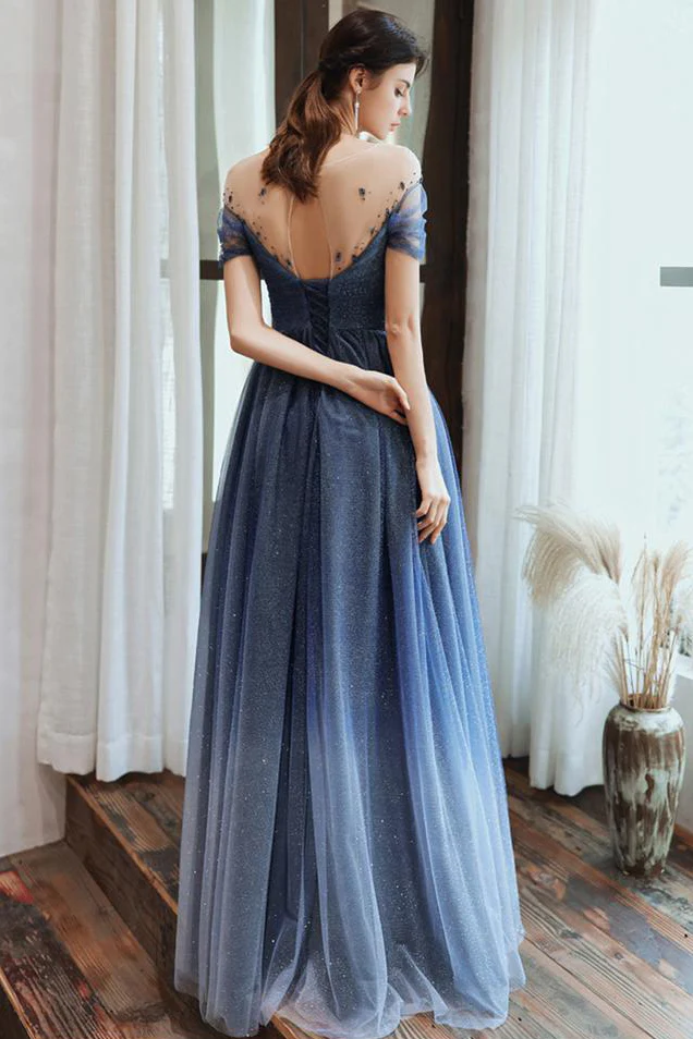 Blue A-line Tulle Prom Dress for Women Long Evening Dress Graduation Dress OKV89