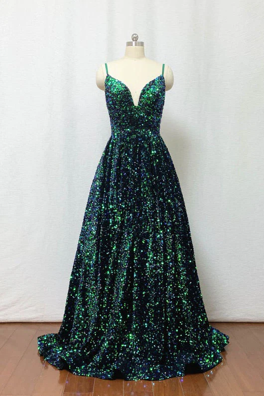 A-line Sequin Prom Dress Spaghetti Straps Forest Green Long Evening Dress OKW6