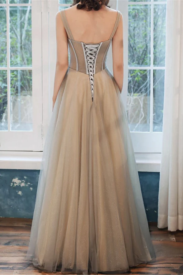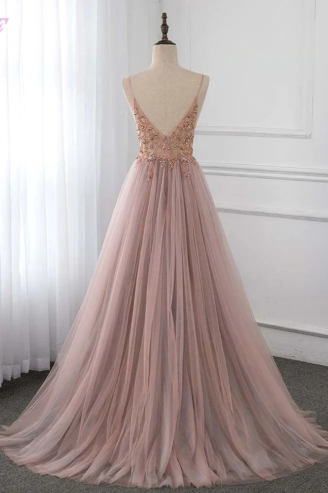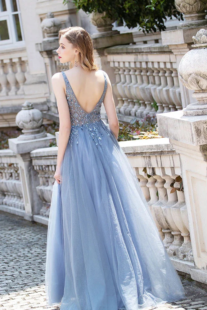 Sexy A-line Tulle V Neck Slit Long Prom Dress With V Back OKV78
