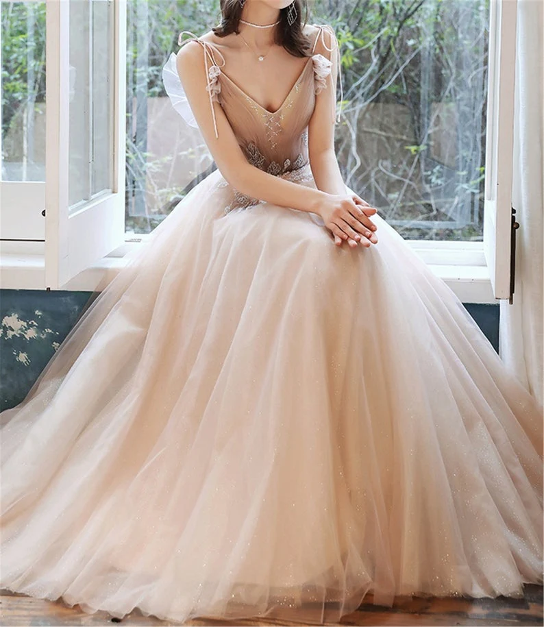Beaded Tulle Fairy Prom Dress For Women V-Neck Long Party Dress Floor Length Evening Dress OKV92