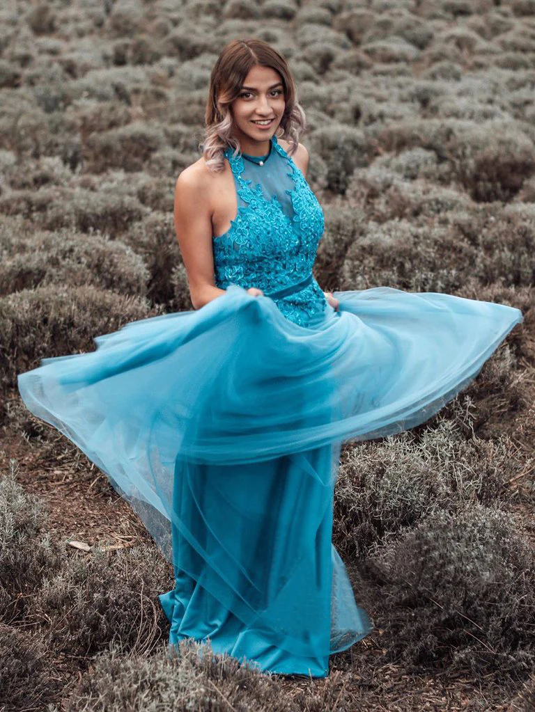 Chic A-line Halter Neck Tulle Lace Appliqued Floor Length Prom Dress OKV76