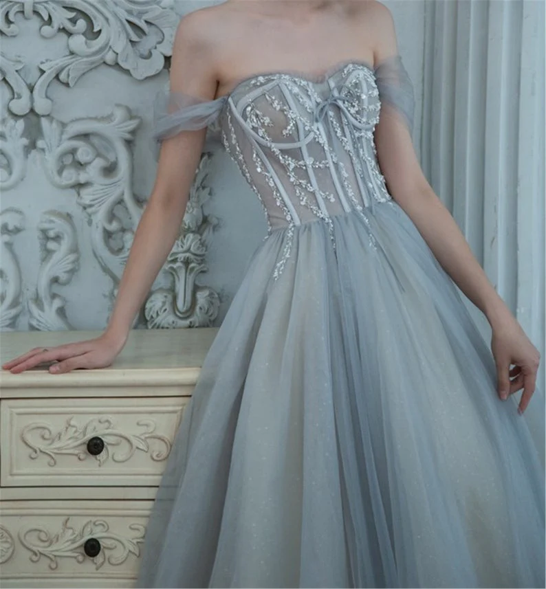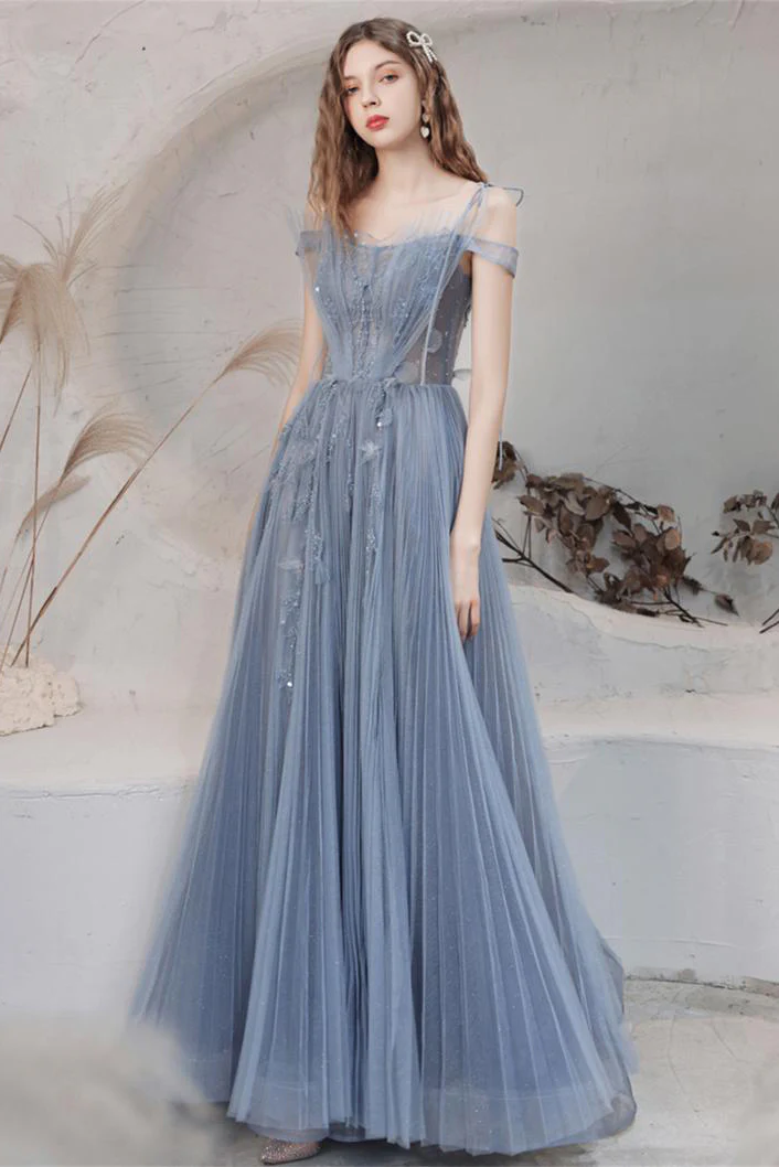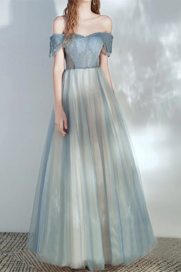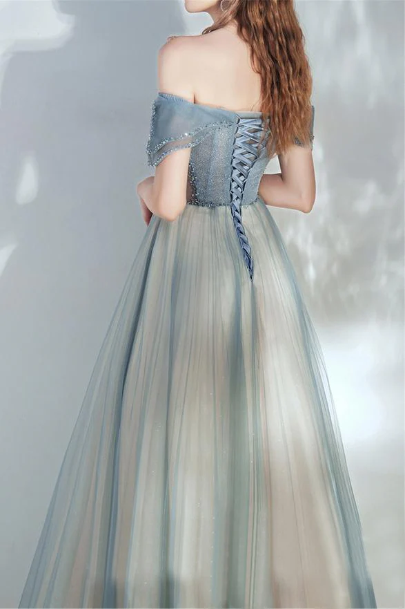Off Shoulder Dusty Blue Prom Dress Lace Up Tulle A-line Evening Dress Senior Prom Dress OKV90