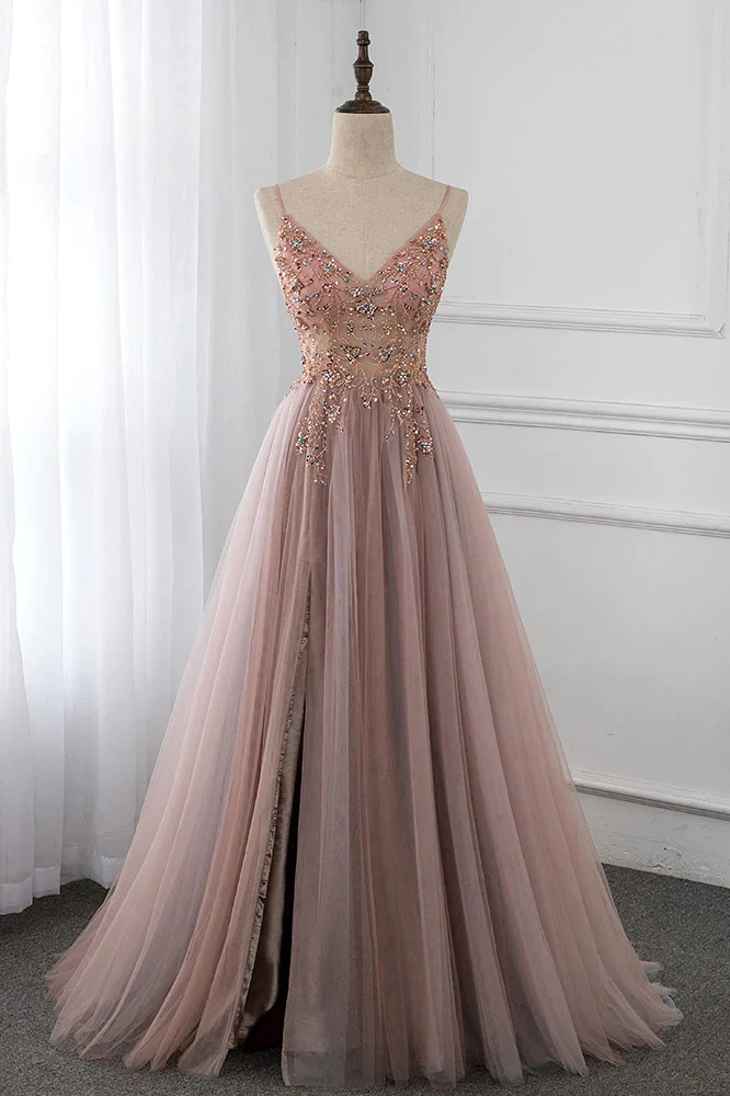 Sweet Dusty Pink Crystal Prom Dress Long Straps Spaghetti Tulle Evening Gown OKV96