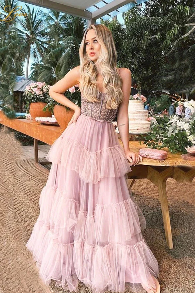 Pink Layers Prom Dress Long A-line Beaded Party Dress Tiered Strapless Tulle Evening Dress OKW44