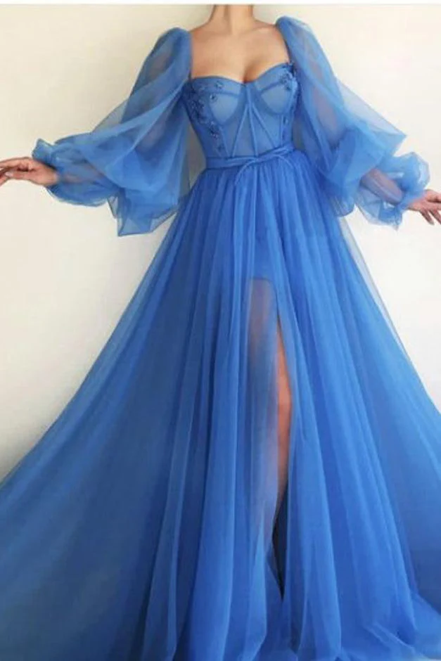 Long Lantern Sleeve Tulle A-line Sky Blue Prom Dress With Slit OKV82