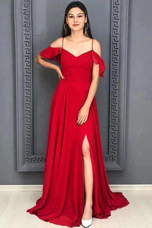 A-line Red Chiffon Prom Dress Long Sexy Split Evening Party Gowns OKW35
