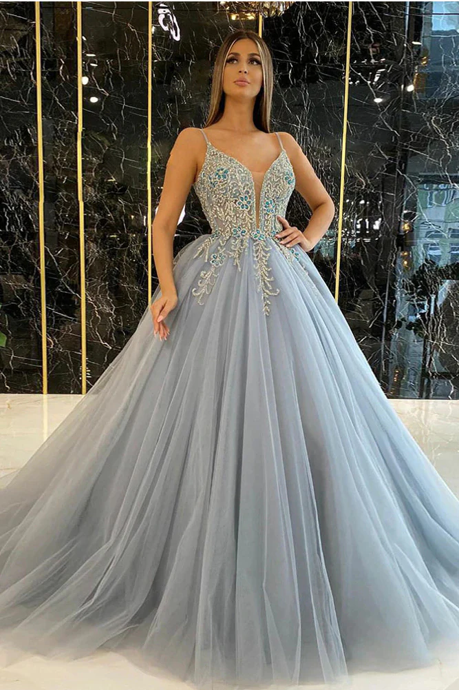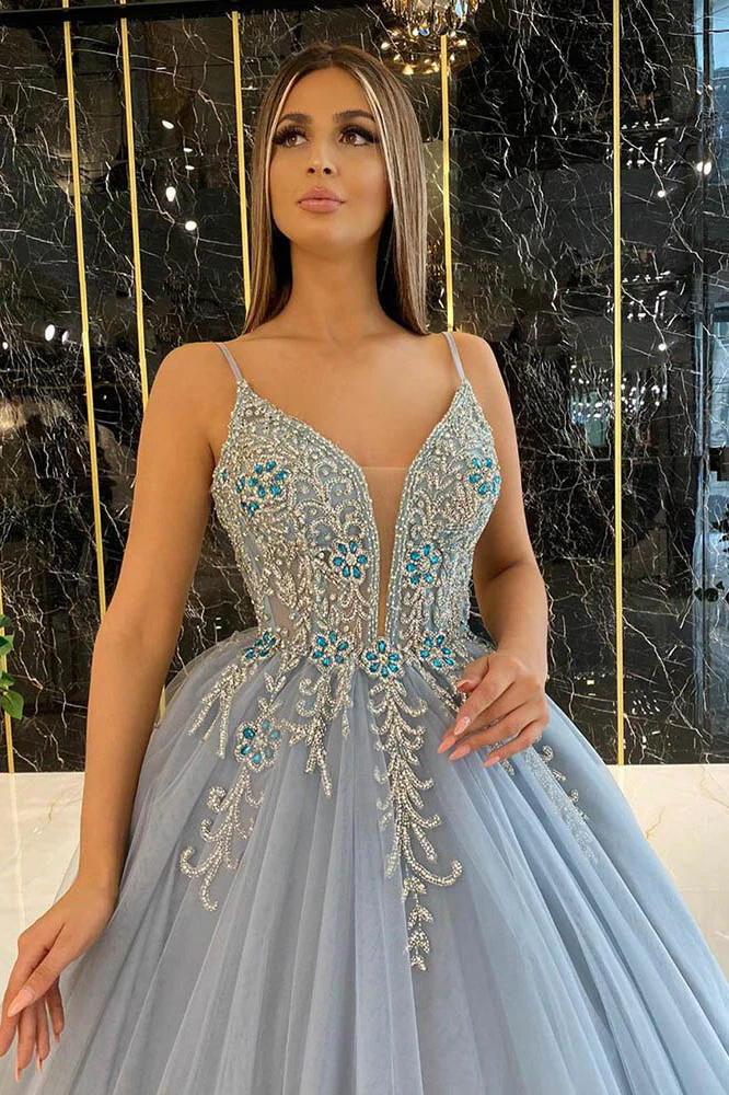 Dusty Blue Ball Gown Prom Dress Long Spaghetti Straps Tulle Crystals Beaded Formal Party Dress OKV97