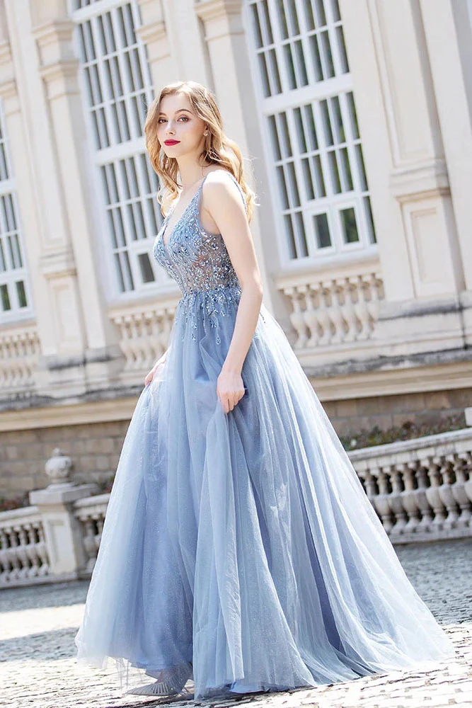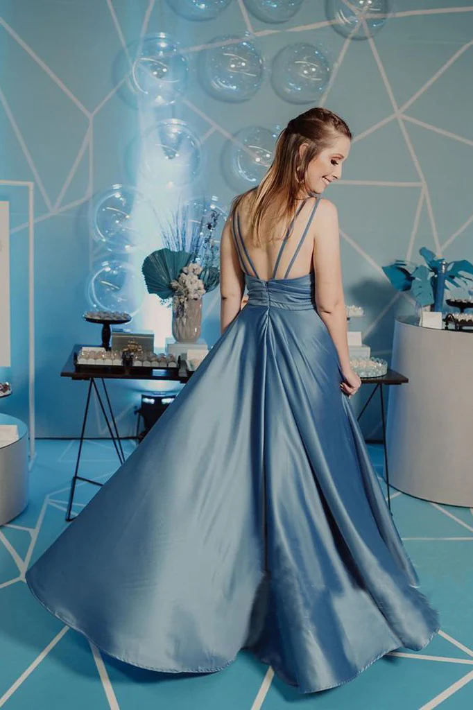 Sky Blue Cross Back Prom Dress Long Elegant V-neck Evening Dress OKW32