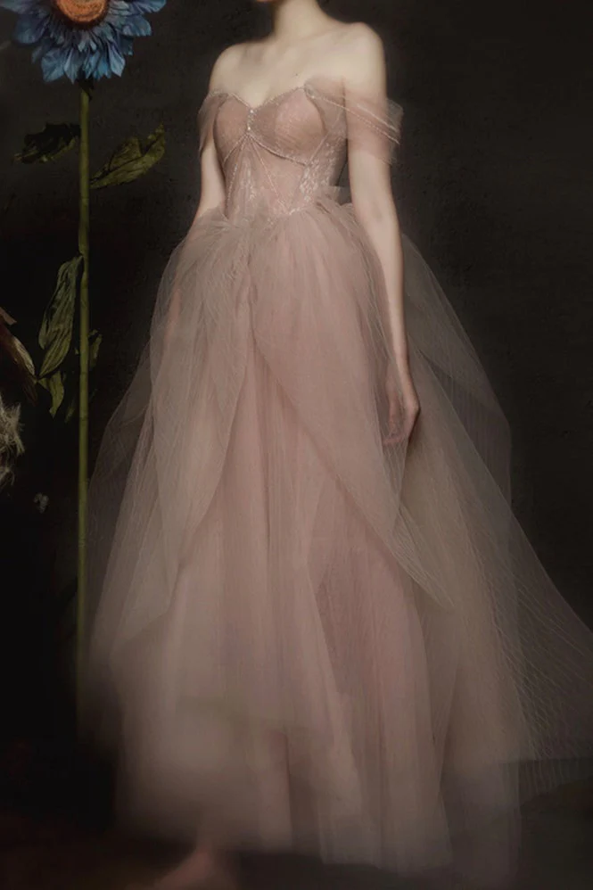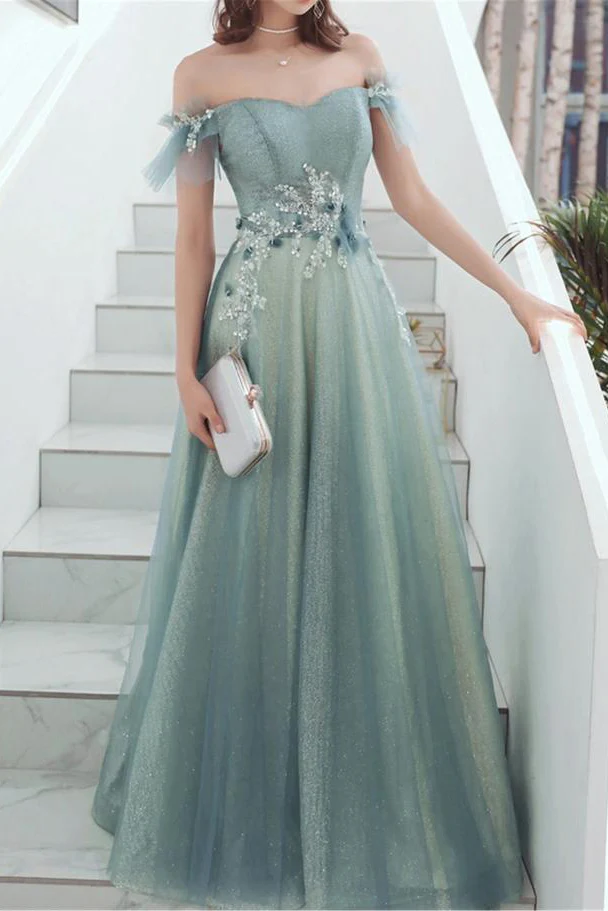 Off the Shoulder A-line Tulle Prom Dress For Women Long Party Dress OKW10