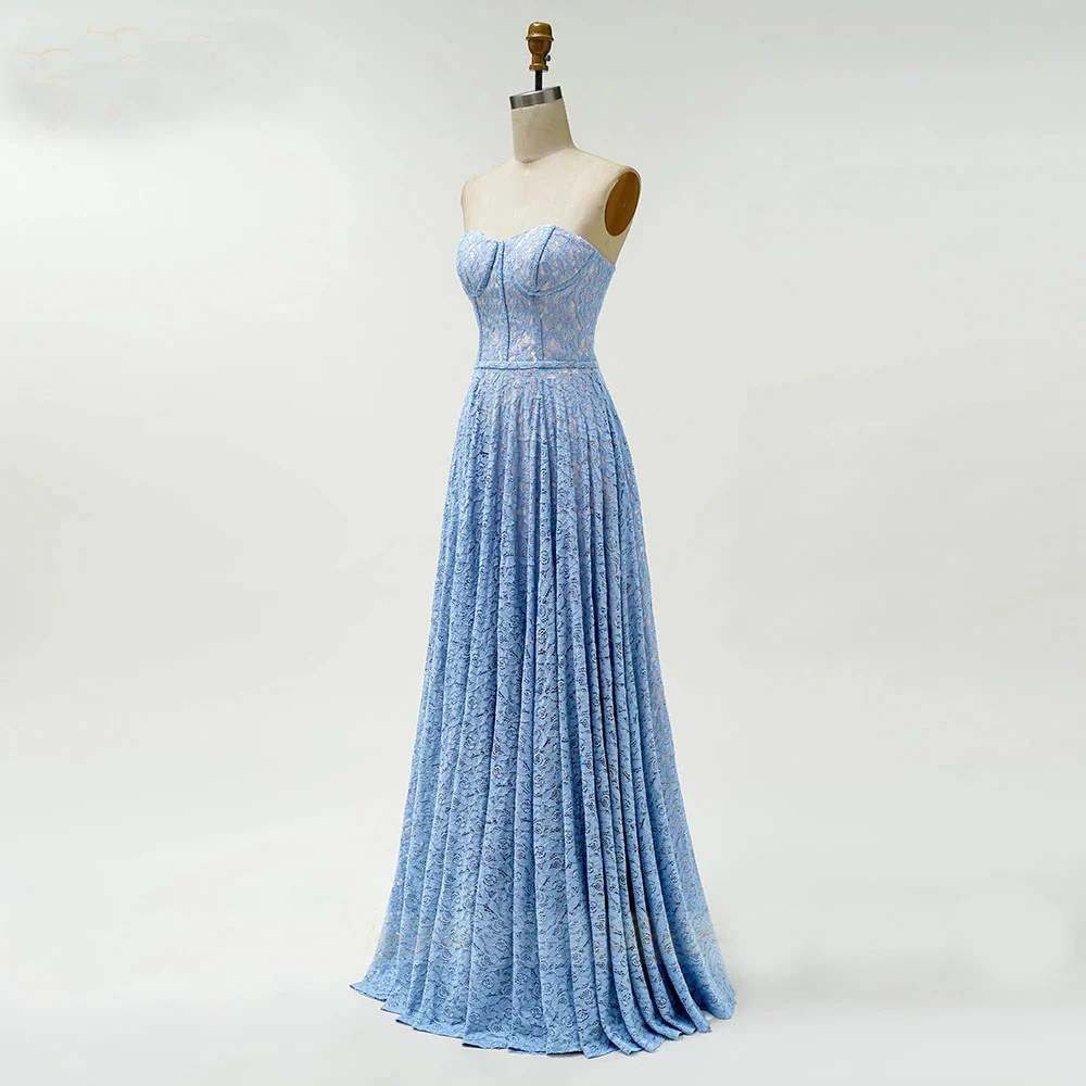 Blue Long Evening Dress Lace Bodice Formal Dress Sweetheart Neck A-line Prom Dress OKW45