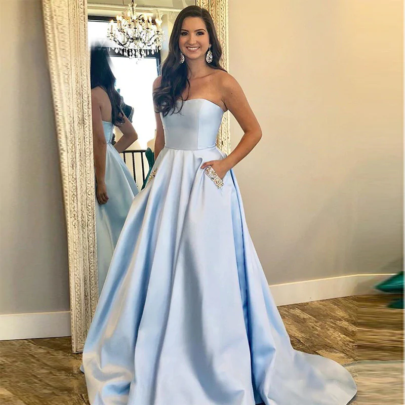 Light Sky BLue Prom Dress With Pocket Strapless A-line Long Formal Party Dress OKV94