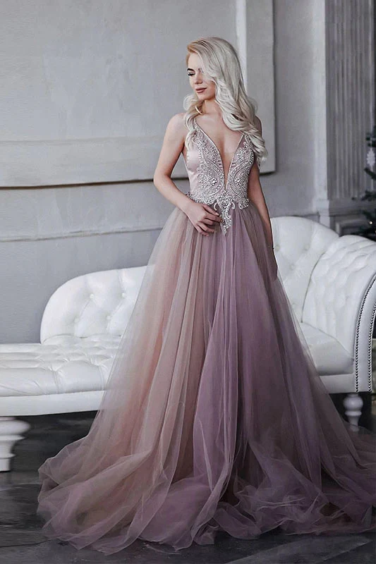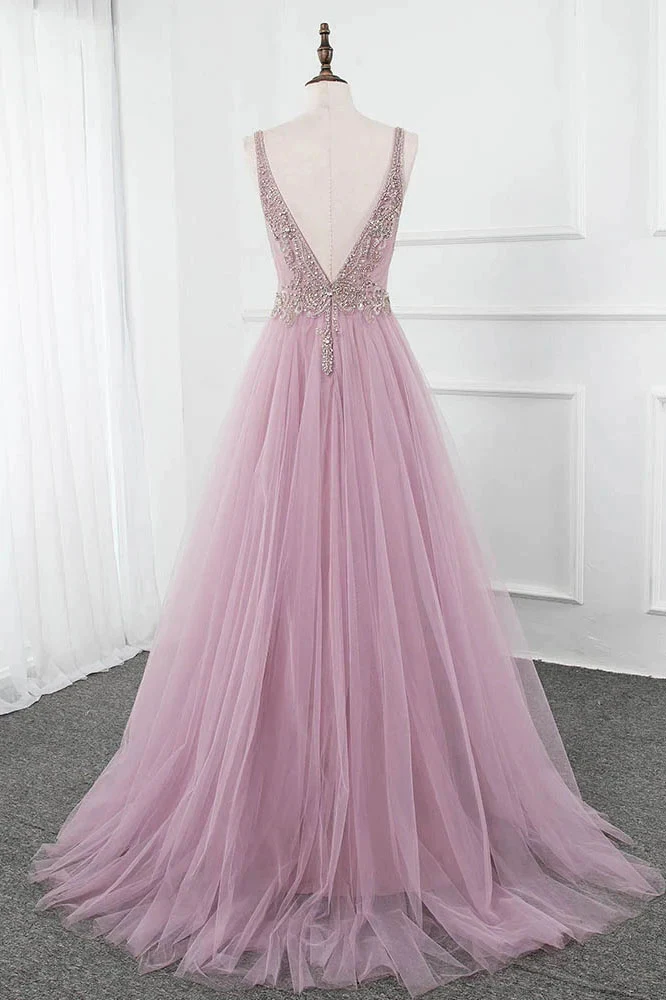 Pink V Neck Tulle Lace Appliques Long Prom Dress A-line Beading Evening Dress OKX29