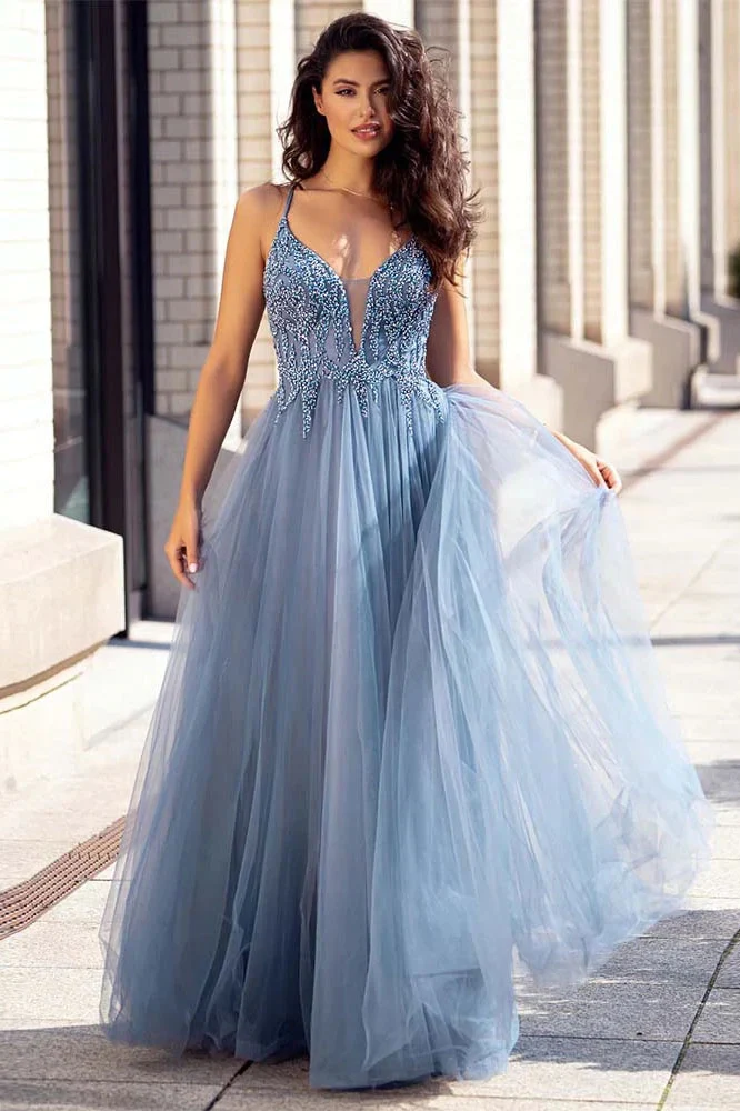 Dusty Blue Tulle Long Prom Dress Beaded Aline Formal Gowns OKW69