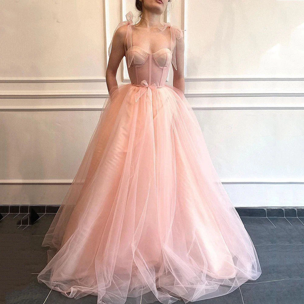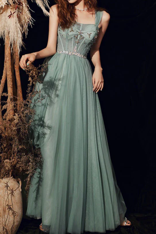 A-line Fitted Boning Prom Dress Spaghetti Strap Tulle Long Evening Gowns OKW77