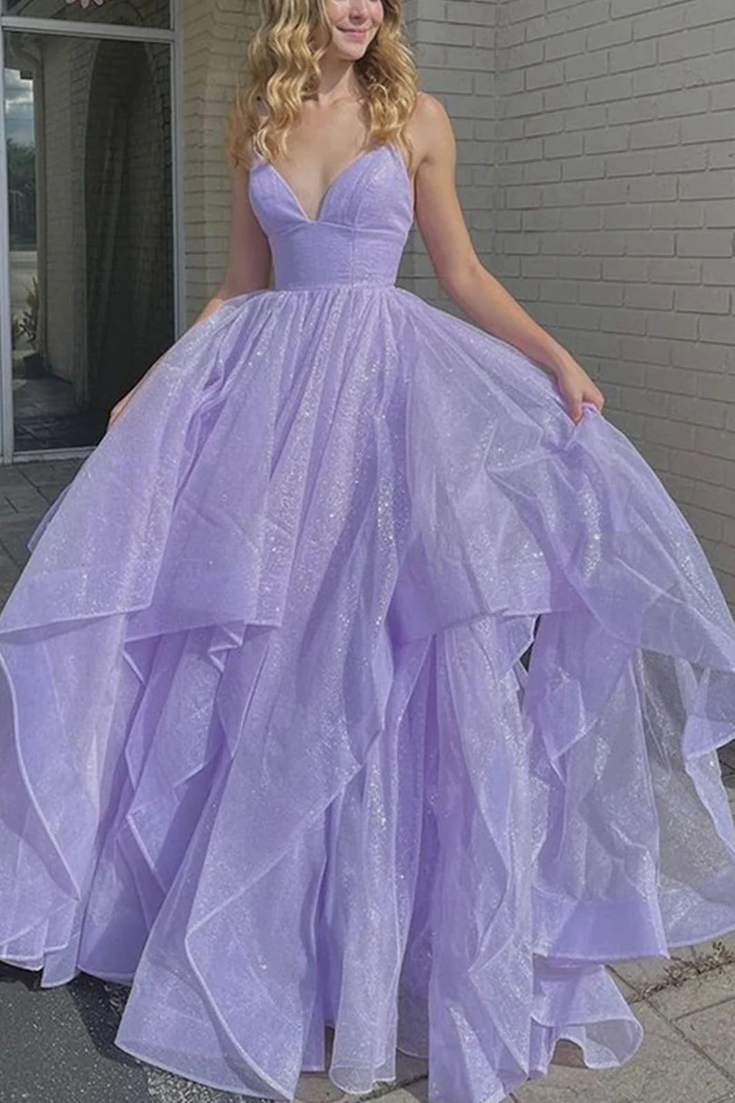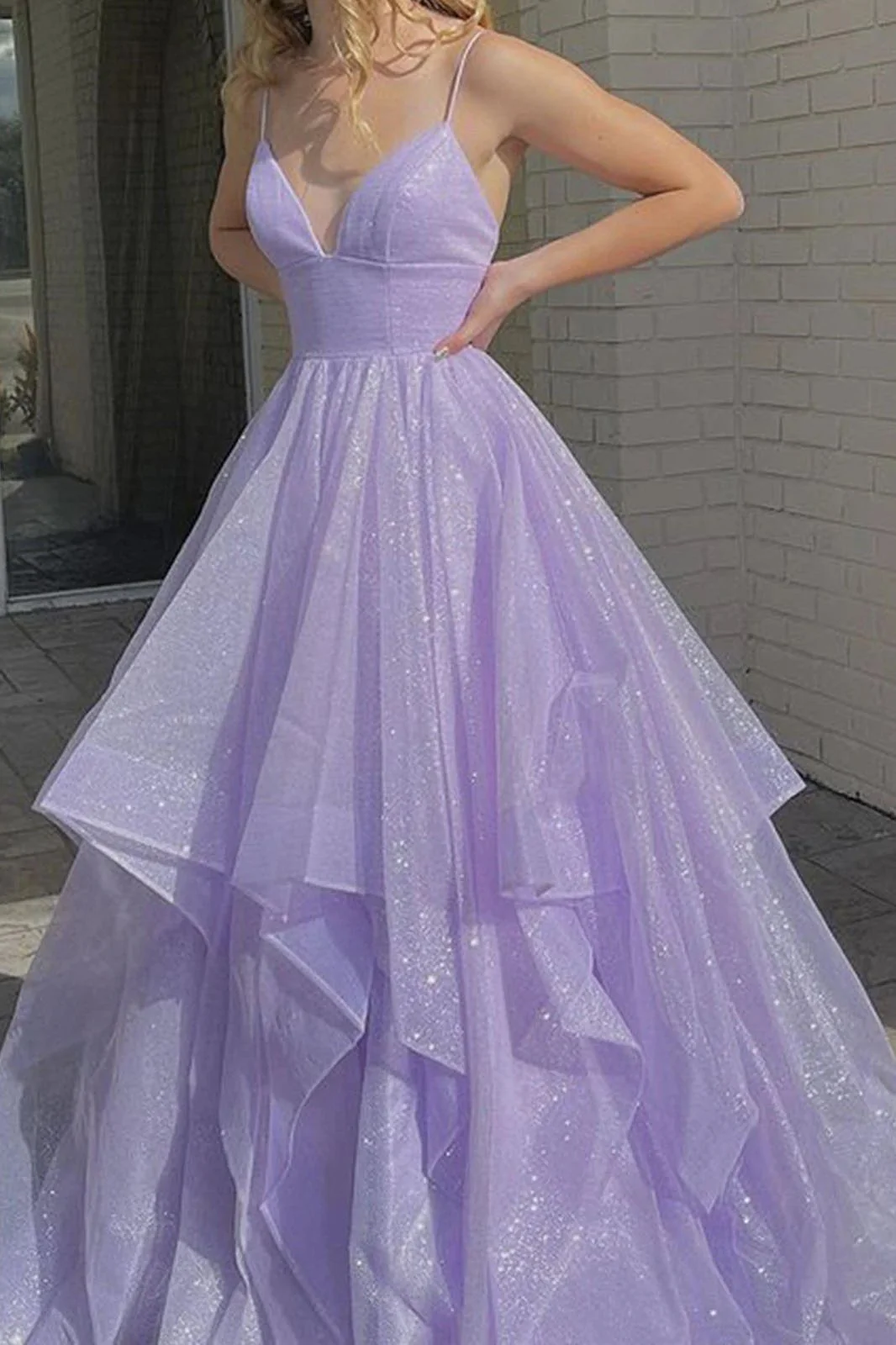 V Neck Lilac Long A-line Prom Dress with Pocket Shiny Formal Dress Sparkly Evening Dress OKX20