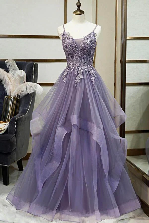 Charming Tulle A-line V-neck Spaghetti Straps Long Prom Dress With Lace Appliques OKX36