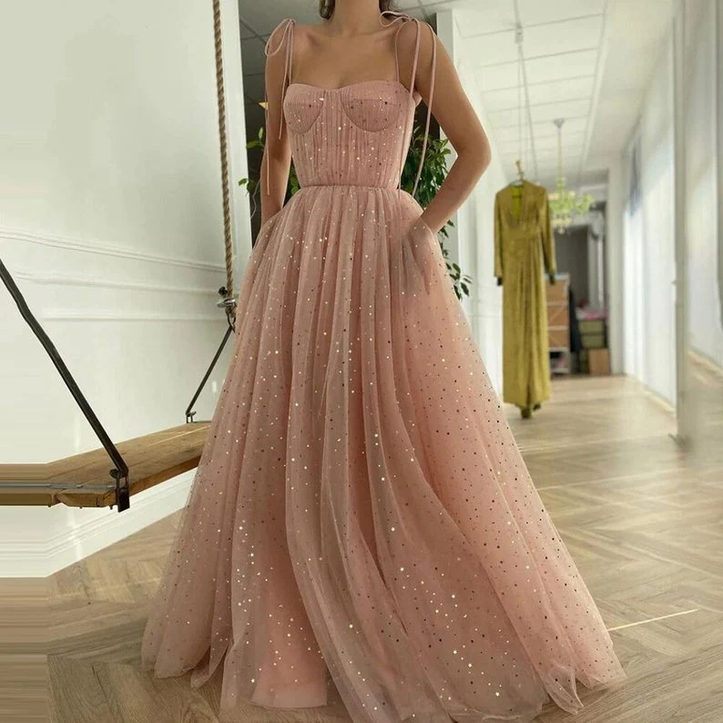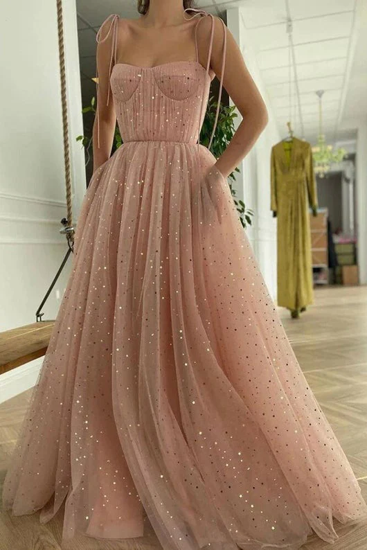Pink Sequin Long Formal Prom Dress Tulle A-line Spaghetti Straps Evening Gown Dress OKW98