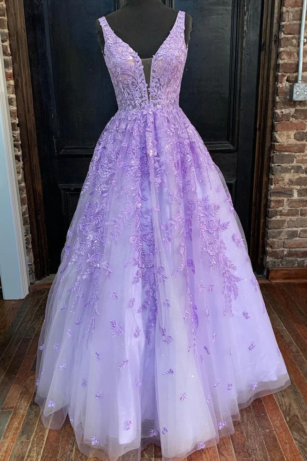 V Neck Purple Lace Appliques Prom Dress A-line Long Formal Evening Dress OKX32