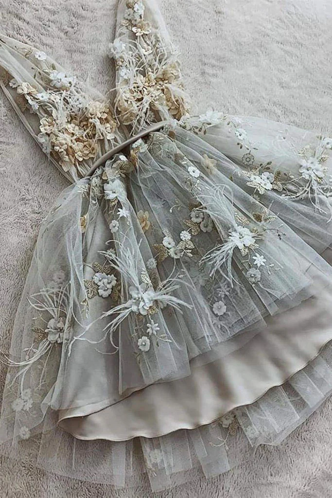 Cute V Neck Floral Short Gray Prom Dress Lace Formal Appliques Graduation Homecoming Dress OKX42