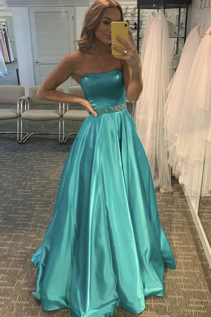 Strapless Green Satin Long Prom Dress A-line Beaded Formal Evening Dress OKX8