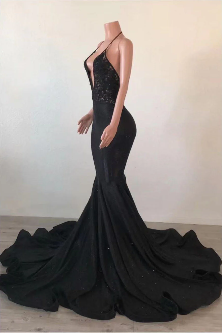 Sexy Black Mermaid Halter Backless Prom Dress With Lace Top OKW63