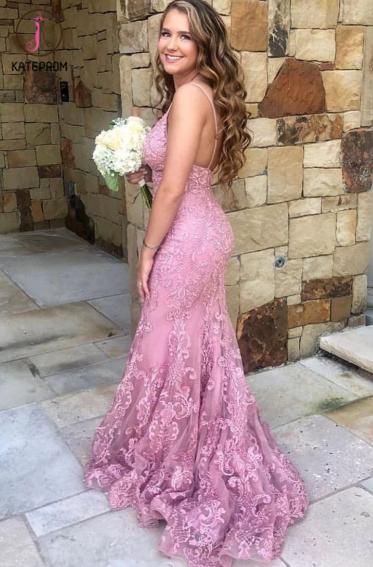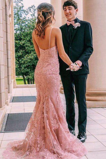 Elegant Spaghetti Straps Mermaid Lace Appliques Prom Dress OKX31