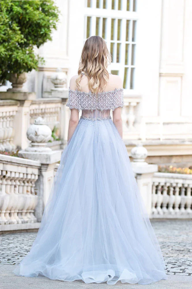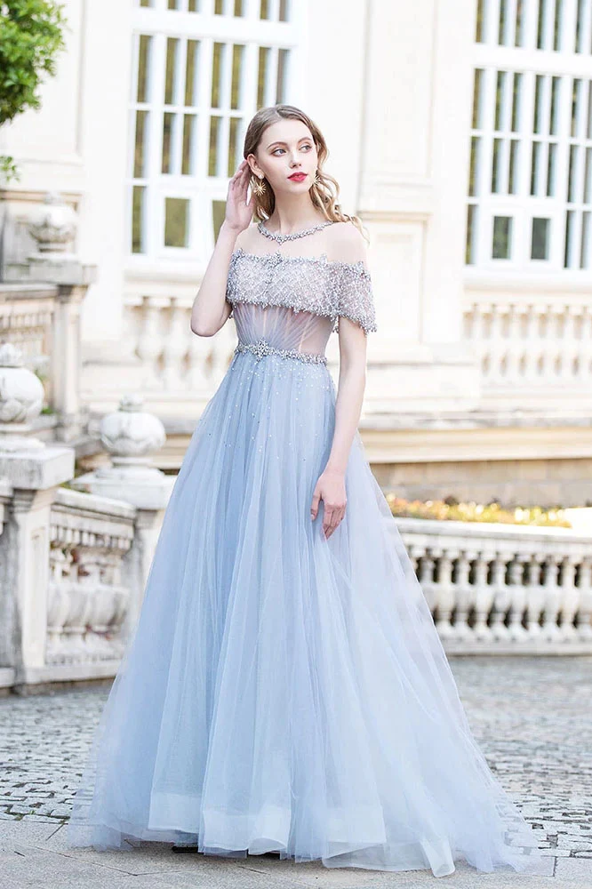 Light Blue Tulle Long Prom Dress Beaded Aline Formal Gowns OKW68
