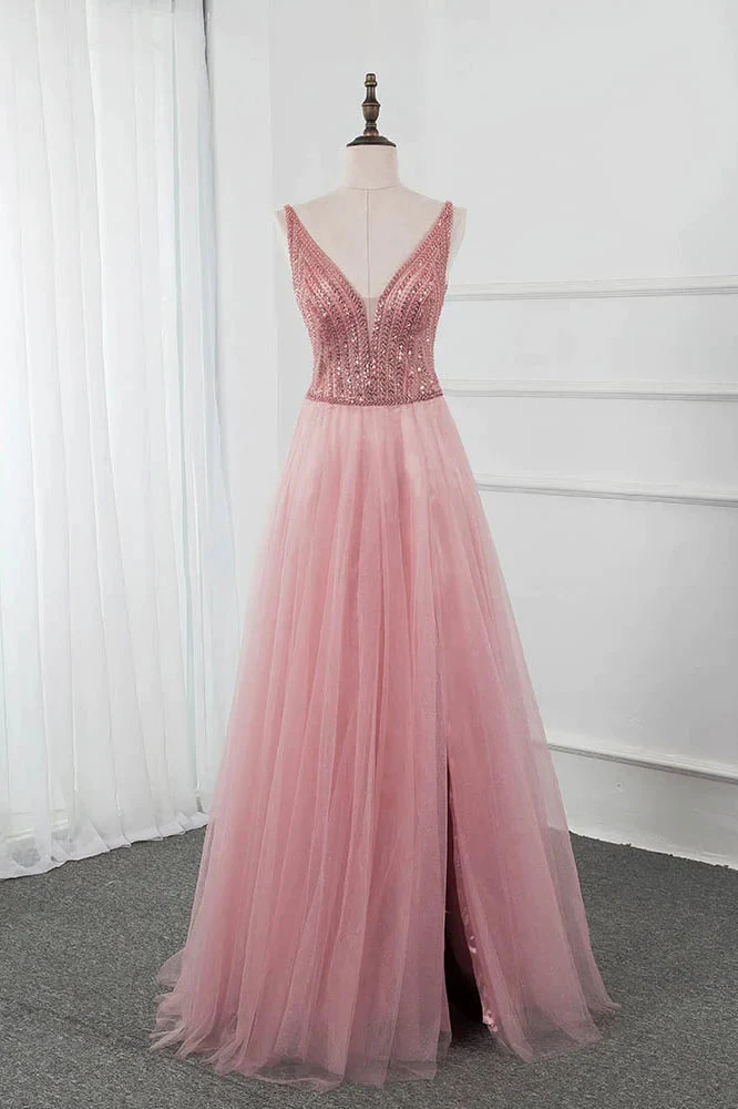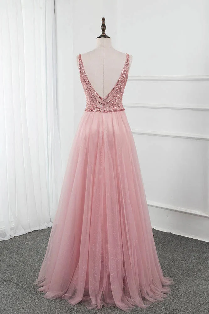 Pink Split Long Prom Dress Beading Sequined Tulle V Neck Sleeveless Party Gown OKW73