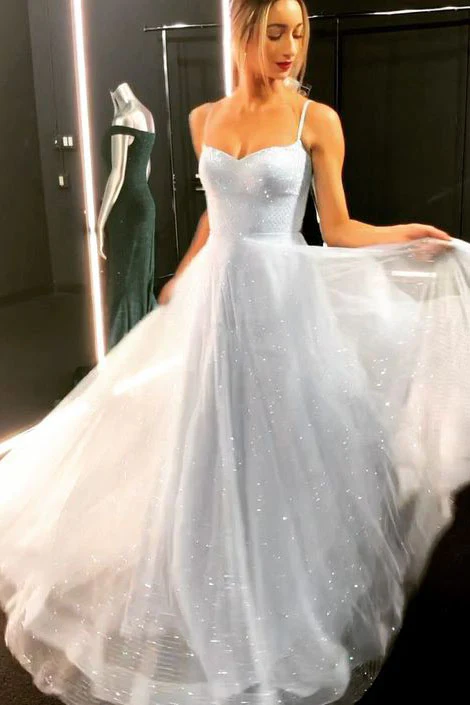 Sparkly Spaghetti Straps A-line Tulle Sequins Long Prom Dress OKW87