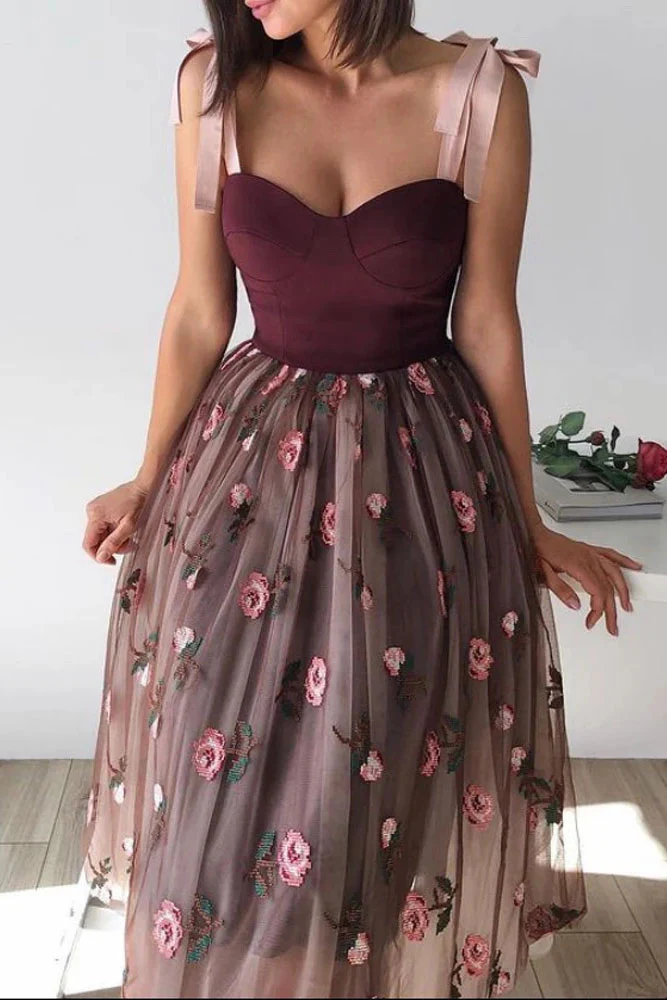 A-line Tulle Short Prom Dress Floral Skirt Tea Length Women Casual Gown OKW86