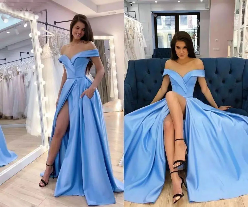 Sky Blue Prom Dress Sexy V-neck Off shoulder High Split A-line Evening Dress OKW76