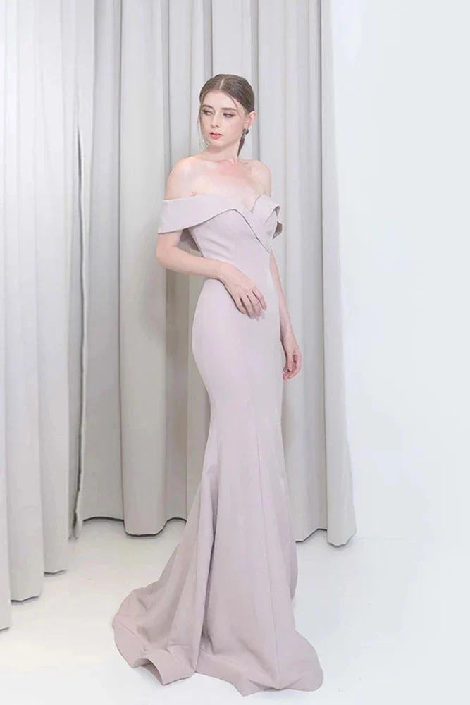 Simple Blushing Pink Off Shoulder A-line Satin Long Prom Dress OKW90