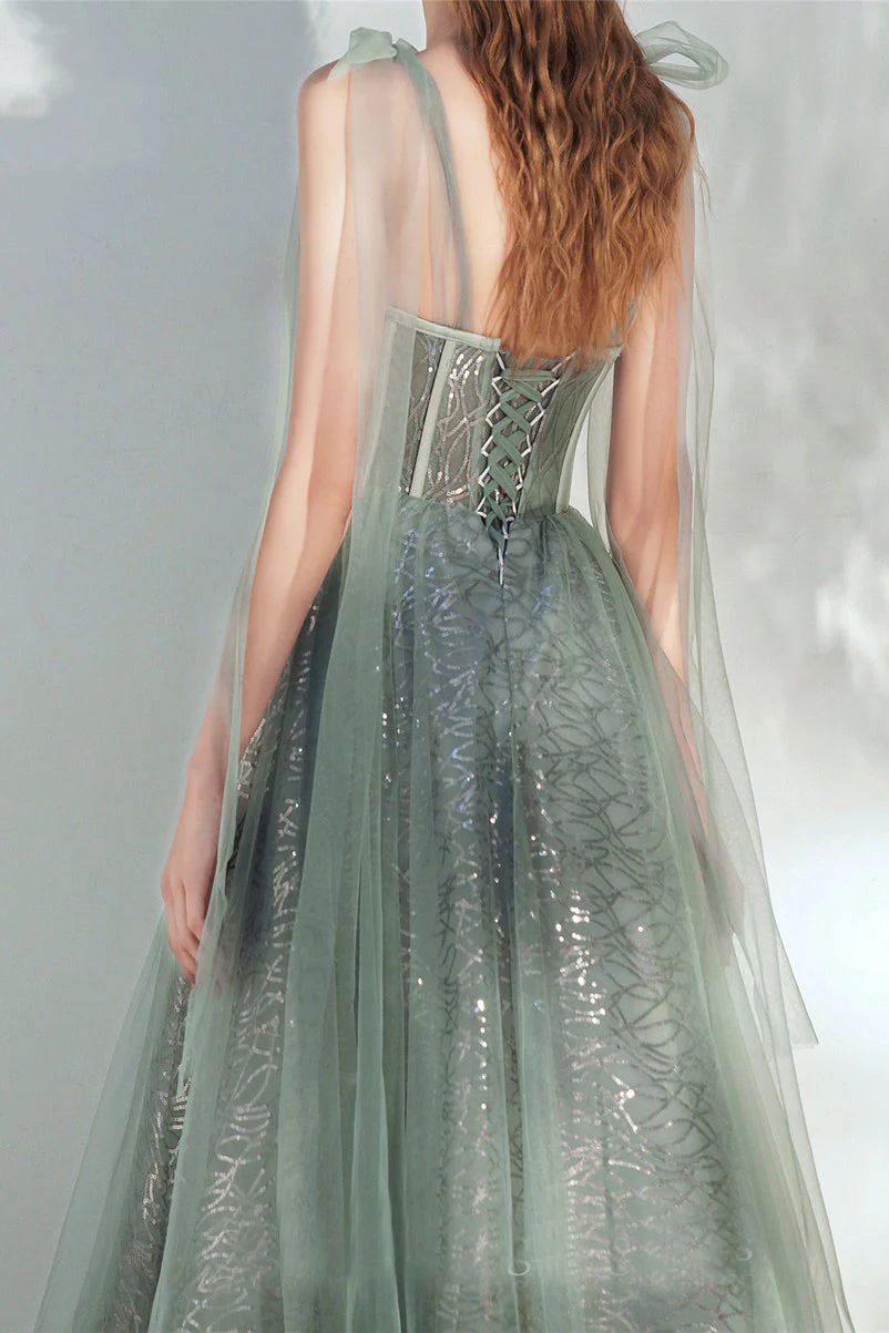 Green Spaghetti Straps Prom Dress Fairy Evening Party Dress Lace-up Slleveless Prom Gown OKW78