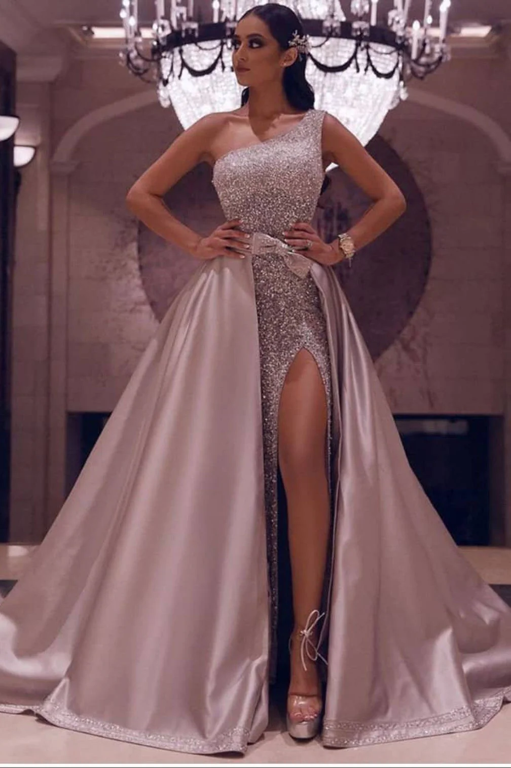 Sexy Satin High Slit One Shoulder Prom Dress Long A-line Evening Dress OKW83