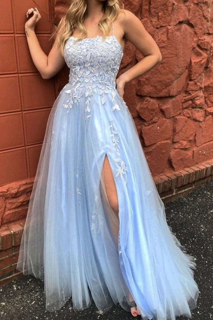 Elegant Spaghetti Straps Evening Party Dress Sky Blue Appliques Long Prom Dress With Slit OKW81