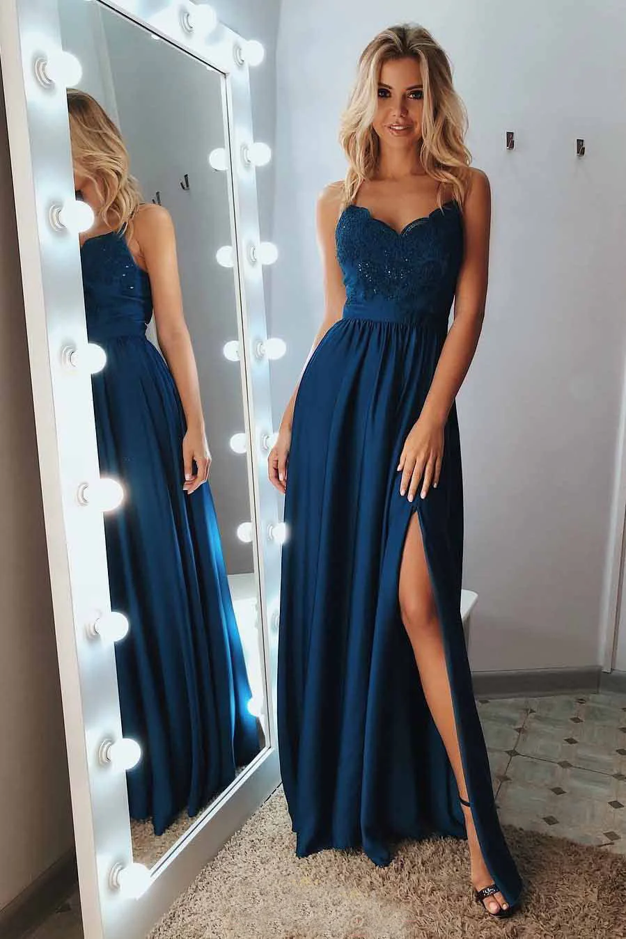 Elegant Sweetheart Spagehetti Straps Blue Lace Appliques Slit Beaded Prom Dress OKX27