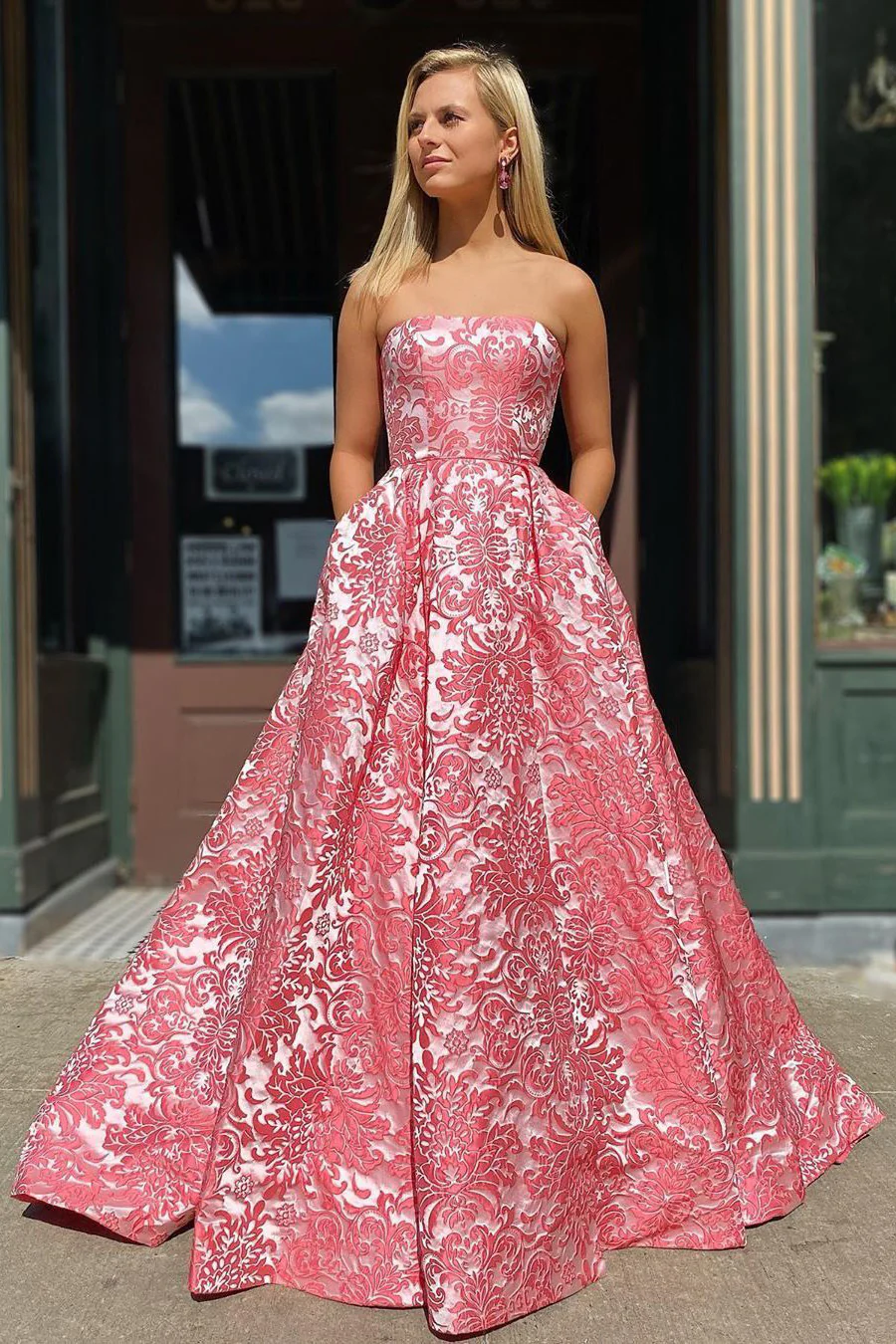 A-line Strapless Modest Cheap Long Prom Dress With Pockets Unique Evening Dress OKX33